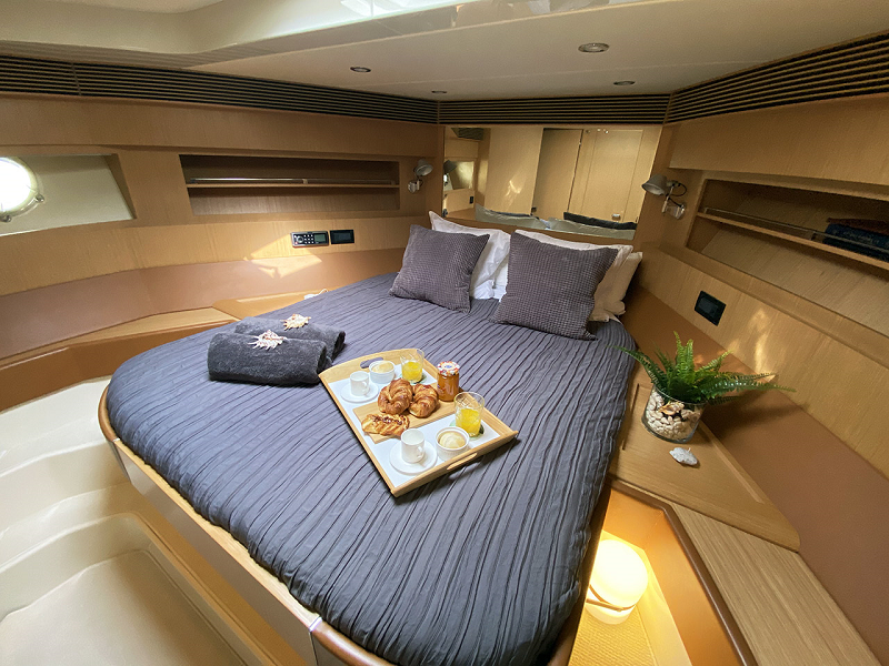 Dispone de tres camarotes para invitados con capacidad para seis personas y un camarote independiente para el capitán. En los chárteres de día este yate puede llevar hasta once personas.