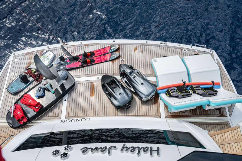 The toys include 2 x Seabob F9, 1 x fliteboard, 2 x paddleboard, 2 x beach platforms, 1 x wakeboard, 1 x waterskis, 8 x snorkeling equipment. The tender is a Williams Sport Jet 460.